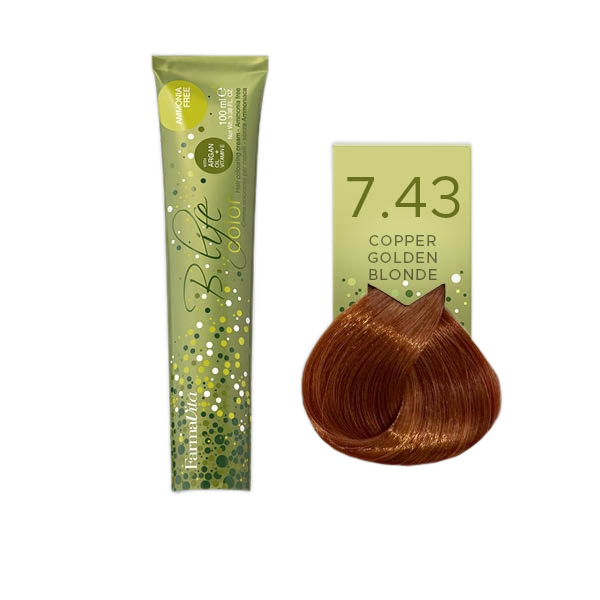 FarmaVita B Life je profesionalna bakarna zlatno plava (7.43) farba za kosu bez amonijaka. Njena nežna formula obogaćena je arganovim uljem koje sprečava alergije, peckanje i svrab, a uz to omekšava, revitalizuje i poboljšava elastičnost kose.