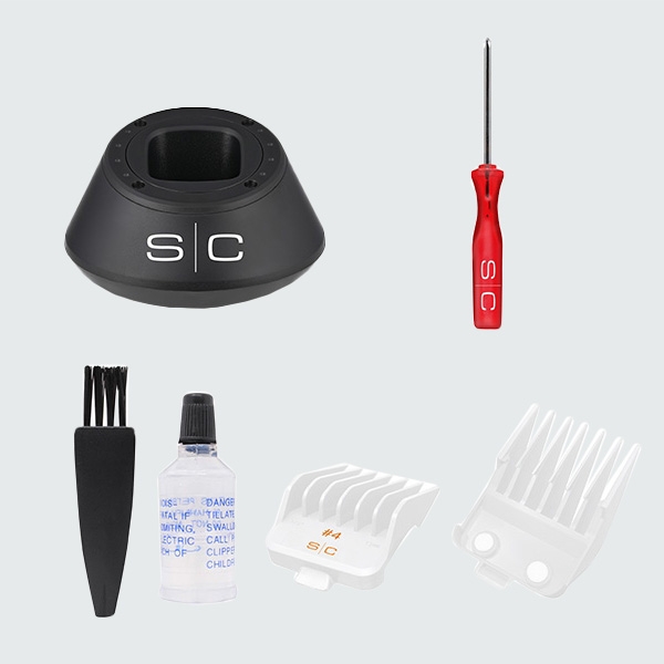 U setu još dolazi: 8 magnetnih češljića (#0,#1,#1.5,#2,#3,#4,#5,#6), baza za punjenje i punjač, 3 zamenska podizača u bojama, 3 maske (transparento crna, pink, bela), za čišćenje i održavanje, šrafciger za zamenu nožića i promenu maski.